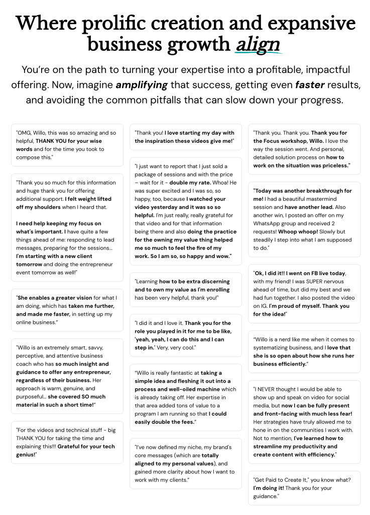Connection, feedback, accountability, and ongoing support from me, Willo Sana, and other members, between calls. Share docs for feedback on copy, design, or offers… I’m in it with you!